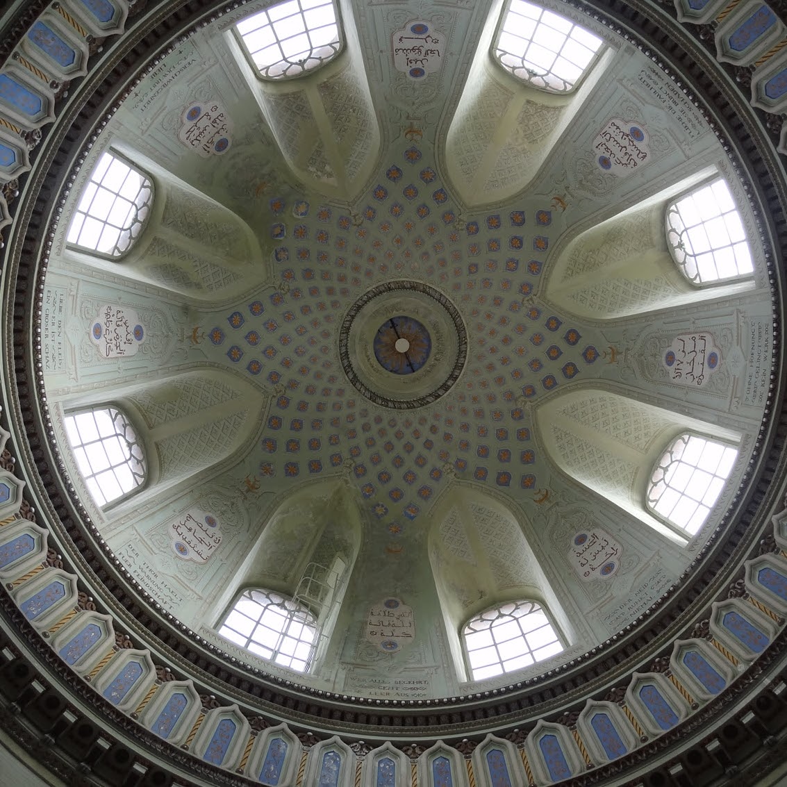 Nicolas de Pigage built the mosque with its central building, the two minarets and prayer courses in 1779. The interior of the mosque consists of a circular central space, which is divided by columns and niches. Inscriptions in Arabic and German language refer to virtues such as wisdom, diligence and discretion. All Arab texts have errors in the dotting of the consonants and the vocalization - a failure of the German mason. It is testimony to the then prevailing interest in the Arab world. It was not built for the purpose of religion but as evidence of tolerance of the enlightened owner Carl Theodor.